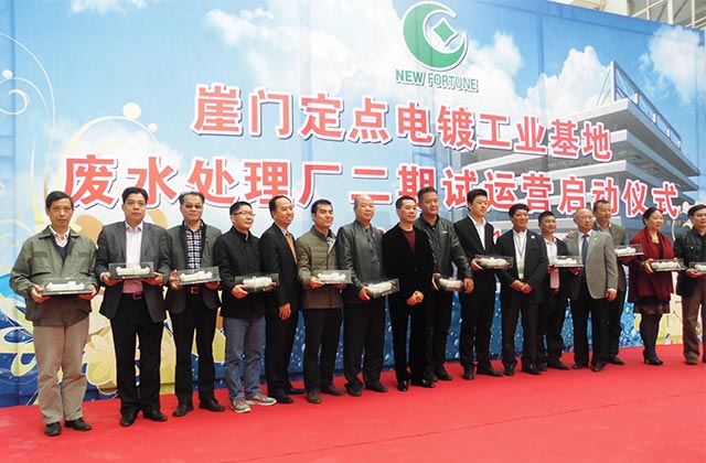 12月11日,江門市崖門新財(cái)富環(huán)保電鍍基地的廢水處理中心二期項(xiàng)目舉行的試運(yùn)營啟動(dòng)儀式。我司副總裁陳達(dá)華參加了該儀式。崖門新財(cái)富環(huán)保電鍍基地的廢水處理中心二期于2013年8月動(dòng)工興建,以“方舟”作為外形設(shè)計(jì),建筑面積為2.2萬平方米。作為珠三角電鍍區(qū)重金屬污染綜合防治重點(diǎn)示范項(xiàng)目,該項(xiàng)目獲得2012年中央財(cái)政重金屬污染防治重點(diǎn)區(qū)域?qū)m?xiàng)資金5790萬元的支持。新建成廢水處理廠共有8條各類廢水處理線,日