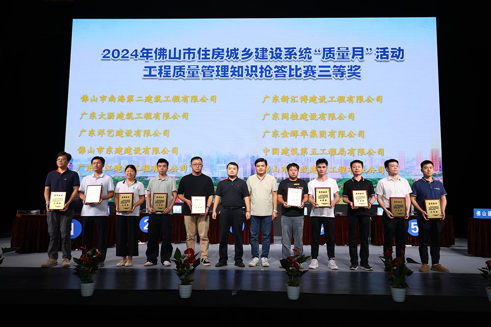 10月12日,由佛山市住房和城鄉建設局主辦的2024年佛山市住房城鄉建設系統“質量月”活動工程質量管理知識搶答比賽圓滿落幕。賽場上,金輝華集團代表隊與其他102家企業選手進行了筆試、搶答競賽等角逐。最終,隊員們憑借自身扎實的專業能力為集團公司贏得了競賽三等獎。
