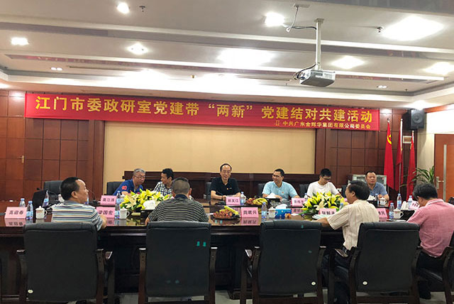 --記我司與江門市政研室結對共建座談會 為切實加強“兩新”黨建工作,鞏固“結對共建”成果,推動黨建創新發展,6月14日下午,江門市委秘書長、市委政研室主任、市委改革辦主任鄭文江,市委政研室副主任、黨支部書記李瀾一行到我司開展黨建專題調研,并召開黨建“結對共建”工作座談會。開平市委辦副主任曹偉平、長沙街道辦黨工委委員蘇國亮、我司董事局主席周珉興、黨委書記、副總裁張解矛、黨委副書記、副總裁盧文權、工