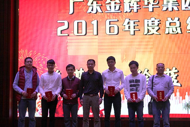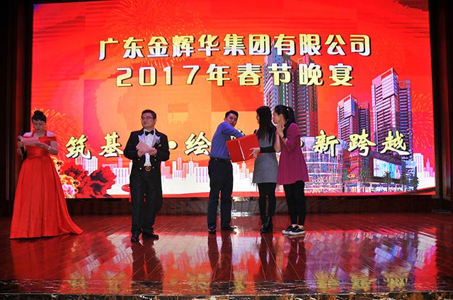 會議中董事局主席周珉興向所有員工發出了新春祝福!主席周珉興、董事長李甫、副總裁張國球、副總裁兼總工程師盧文權、副總裁兼黨委書記張解矛和團委書記譚翠瓊分別宣讀了表彰決定和優秀名單,并分別主持了公司工程優秀創優項目部、“2016省級工法”先進工作者、優秀員工、優秀黨員和優秀團員的表彰環節,領導們為他們頒發了榮譽證書,對他們所作出的成績進行了鼓勵,其中:表彰公司工程優秀創優項目部3個,“2016省級工法”先進工作者3名,優秀員工獎28名,表彰優秀黨員7名,優秀團員5名。最后由工會主席陳維民代表公司向受到表彰的各位同仁表示衷心的祝賀,向奮戰在各崗位的同事致以最真誠的感謝!并勉勵獲獎者們要珍惜榮譽、戒驕戒躁,把獲得的榮譽作為新的起點,在今后的工作中再做貢獻、勇創佳績!我們有理由堅信有這樣一批優秀的員工和團隊,在他們共同努力下,2017年將又是一個收獲的吉祥年。總結大會后,上演了一場歡天喜地的迎春晚會,晚會中,江門市建筑協會會長李耀南上臺作了重要講話,并充分肯定金輝華集團有限公司的成績,勉勵金輝華集團有限公司為重振開平建筑業雄風實現跨越發展再立新功。
