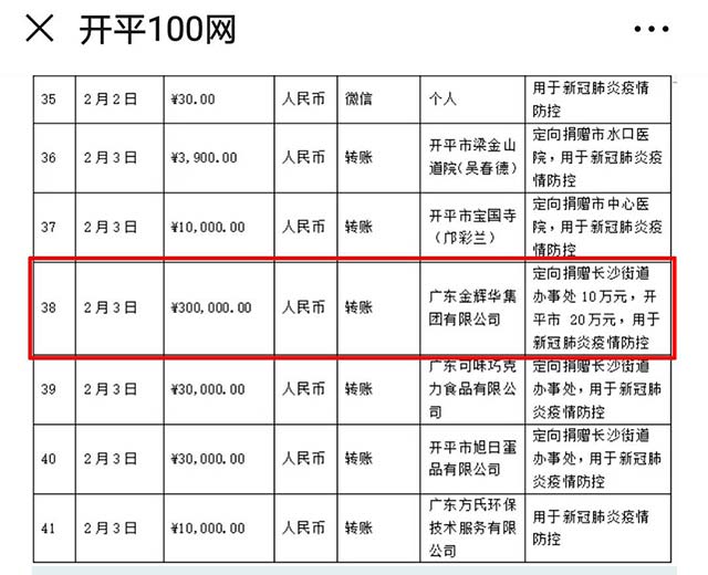 今年春節,一場突如其來的新型冠狀病毒感染的肺炎疫情牽動著每一個人的心,更牽動著每一位金輝華人。新型冠狀病毒感染的肺炎疫情(簡稱“疫情”)發生后,在習近平總書記:生命重于泰山,疫情就是命令,防控就是責任的指引下,并在開平市新冠肺炎疫情防控指揮部的統一部署下,開平市紅十字會,慈善會共同發布了《開平市紅十字會、開平市慈善會關于募集我市疫情防控工作資金和物資的倡議書》。廣東金輝華集團有限公司積極響應、踴躍捐贈,體現了本公司“一方有難、八方支援、同舟共濟”的優良傳統。2020年2月3日,公司定向捐贈長沙街道辦事處10萬元,開平市20萬元,合計30萬元用于新冠肺炎疫情防控。用自己的方式,傳遞著建筑人的溫度、溫情和專業力量,展現民營企業的責任擔當,全力做好疫情防控工作,為開平的疫情防控全局作出了積極貢獻。