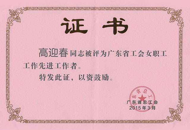 近日,廣東省總工會召開了表彰2009-2014年在工會女職工組織中作出突出成績的先進集體和個人大會,我司工會副主席、女職委主任高迎春同志在會上被授予廣東省總工會“女職工工作先進工作者”榮譽稱號。