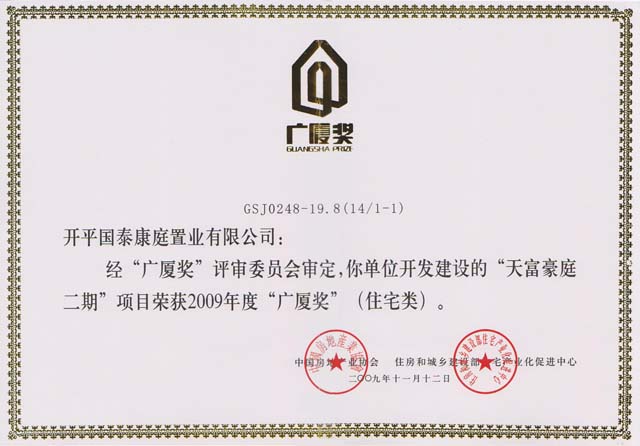 天富豪庭二期是廣東金輝華集團有限公司與開平國泰康庭置業有限公司共同開發的住宅小區,它以獨特的人文景觀及設計水平、環境質量、功能配置、科技含量等諸多優勢,在全國眾多參評項目中脫穎而出,這是天富豪庭全體開發者和建設者的光榮。此次天富豪庭二期入圍2009年“廣廈獎”,成為廣東開平首個獲此榮譽的房地產項目。